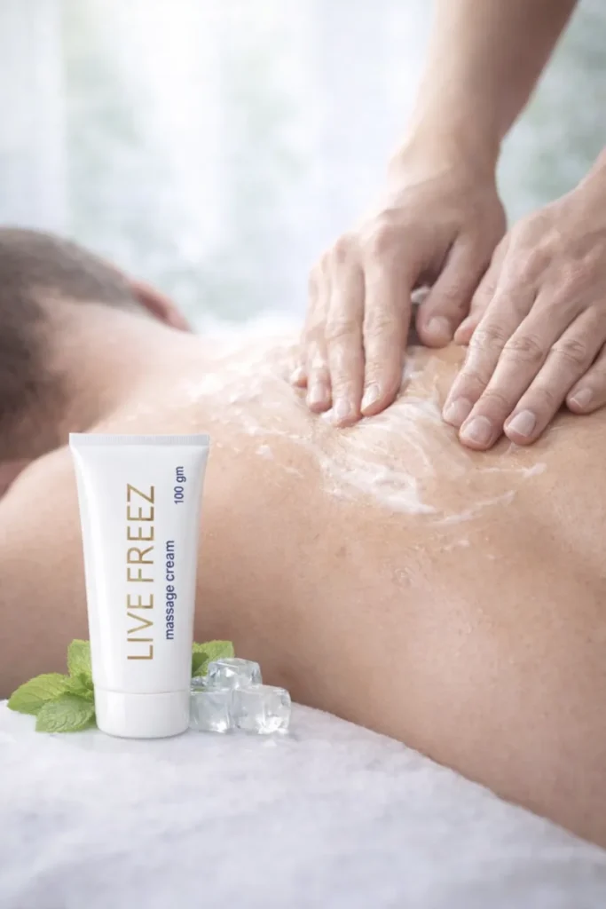 LIVE FREEZ Massage Cream is a topical massage cream formulated to provide a cooling effect with analgesic and anti-inflammatory effects, helping to relieve muscle discomfort and support relaxation during massage.